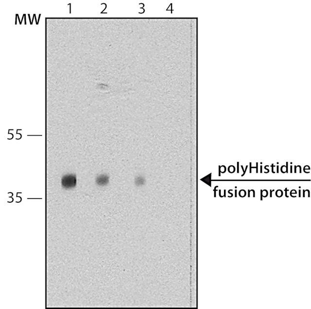 单克隆抗多组氨酸(小鼠 IgG2a 同种型)来源于小鼠骨髓瘤细胞与用重组 HIS 标签融合蛋白免疫的 BALB/c 小鼠脾细胞融合产生的 HIS-1 杂交瘤。从生物反应器中生长的杂交瘤细胞培养物上清液中纯化抗体。单克隆抗多组氨酸识别天然以及变性、还原形式的合成多组氨酸或多组氨酸标记的融合蛋白。产物与原核 pET、pRSET 和 pTrc 表达载体表达的融合蛋白反应。该抗体优先识别 N-末端标记的融合蛋白。